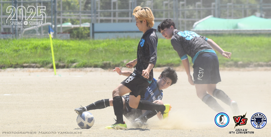 試合は互いに中盤のプレスが強く決定機を作れないなか、前半10分に痛恨のミス。バックパスをクリアミス、すばやく拾ったRWG矢野選手[11]がゴールを奪い先制点を獲得。さらに飲水タイム直後、ブルーウェーヴのCKからCF橋詰選手[14]が押し込み追加点。